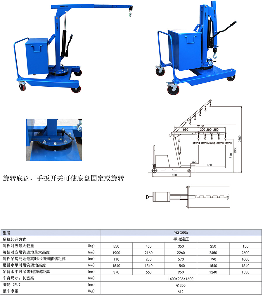 ● 吊臂長(zhǎng)度可五工位手動(dòng)調(diào)節(jié)配有鍛造重載可旋轉(zhuǎn)吊鉤。